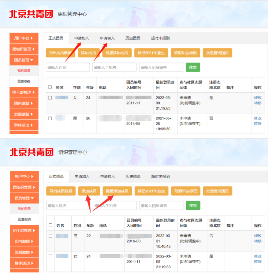 第89团支部 5151825 团支部审核方法 团员/团干部注册后,需要所申请的团支部在电脑端进行相应的审核/添加操作 审核团员:我的团员→申请加入→同意/拒绝。 添加团员:如果未能成功收到申请,待转入团支部也可以使用线上系统中“我的团员→添加团员”按钮,通过团员姓名和身份证号直接将团员添加至本组织。 【档案流转】 请等待后续团委通知,但请各新生团员准备好入团志愿书和团员证。在班级团支部建立后,将由各班团支书收集支部团员的团员档案。 团关系转接Q&A 1.团员档案主要包括哪些材料? 答:团员档案主要包括《中国共产主义青年团入团志愿书》、入团申请书、团员证等。团员档案遗失或不完整的,一般由其隶属团组织或入团时所在单位团组织出具证明。 2.补办团员档案有什么要求? 答:①团员身份核实无误的,可按程序补办团员登记表、团员证等作为团员身份证明,不补办入团志愿书。②补办团员档案及相关证明材料须真实可信,对提供虚假材料和档案的应当追究相关单位和个人的责任。 3.不及时转接组织关系会有什么影响? 答:容易造成团员与组织失去联系,无法参加组织生活、行使团员权利、履行团员义务;可能导致团员身份难以核实,在申请入党、参加公务员或事业单位、国有企业招考、参军入伍等方面受到影响;无法参加团内荣誉表彰等。 4.请问我已经是党员了,还要转接团组织关系吗? 答:需要。根据《团章》规定,团员入党以后仍保留团籍。因此已经入党的学生团员若未年满28周岁,应转接团组织关系。 5.京外团员如需依托“智慧团建”系统,应如何开展线上转接? 答:有相关“智慧团建”转出需求的团员,可以通过PC端网页版(//zhtj.youth.cn/zhtj/)或微信小程序(团中央智慧团建云平台)登录“智慧团建”系统。账号为本人身份证号码,初始密码为身份证后八位,如忘记密码则需通过所属支部团支书进行协助修改密码。 进入【关系转接】版块,根据界面提示操作即可。 注意:团员在智慧团建系统发起转入北京共青团线上系统的申请时,智慧团建中“转入组织属于哪个省”处则应选择北京。 团员在智慧团建系统中选择申请转入团组织时,可以使用关键字进行检索,但一次最多显示10条数据,如果检索结果中没有显示正确的转入团组织全称,请使用更加精确的关键字如“中国共产主义青年团91吃瓜