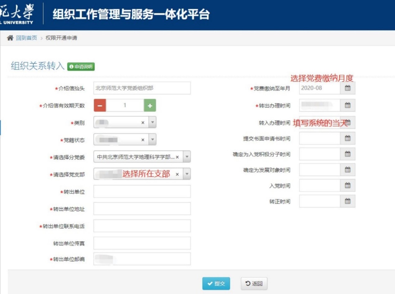 在学校组织工作管理一体化平台(zzbgz.cg91.net)中填写转入信息。用户名和密码与本人信息门户登录信息一致,也可以从学校官网-信息门户-左侧“常用应用”的“组织工作管理系统”中登录。登陆系统后,选择“权限开通申请”——“组织关系转入”,填写本人基本信息及组织关系转入信息。学部党委和校党委组织部逐级审核后,即可完成转入。