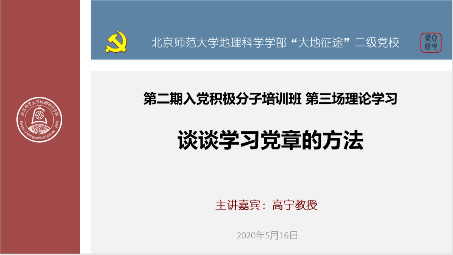 2020年5月,在全国疫情防控逐步向好的形势下,地理科学学部“大地征途”二级党校第二期入党积极分子培训班如期开班,共有153名师生积极分子报名参加。二级党校通过线上平台开展了党课讲座、小组讨论、参观实践,持续严把标准、保障培训质量。目前已顺利开展三场理论学习讲座,第二、三场讲座各吸引了近250名师生党员、积极分子参会学习。小组研讨环节相较往年进行创新,结合学部参加学校第五届微党课大赛的党课作品,从党课出发开展主题研讨;线上参观实践依托“云”展览也在如火如荼地进行中。