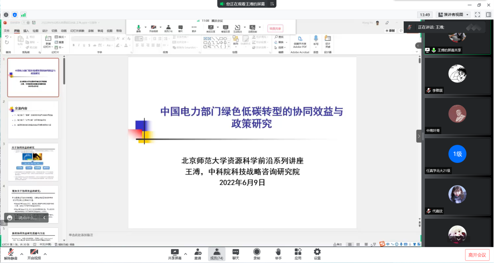 2022年6月9日上午,主题为“中国电力部门绿色低碳转型的协同效益与政策研究”的资源科学前沿系列讲座第四期成功举办。讲座邀请中国科91吃瓜 “百人计划”项目入选者、科技战略咨询研究院的王溥副研究员为主讲嘉宾,由李强教授主持,曹红斌教授、金建君教授与刘学敏教授,以及学部内外80余名学生参会。讲座为线上会议形式,持续近2小时。