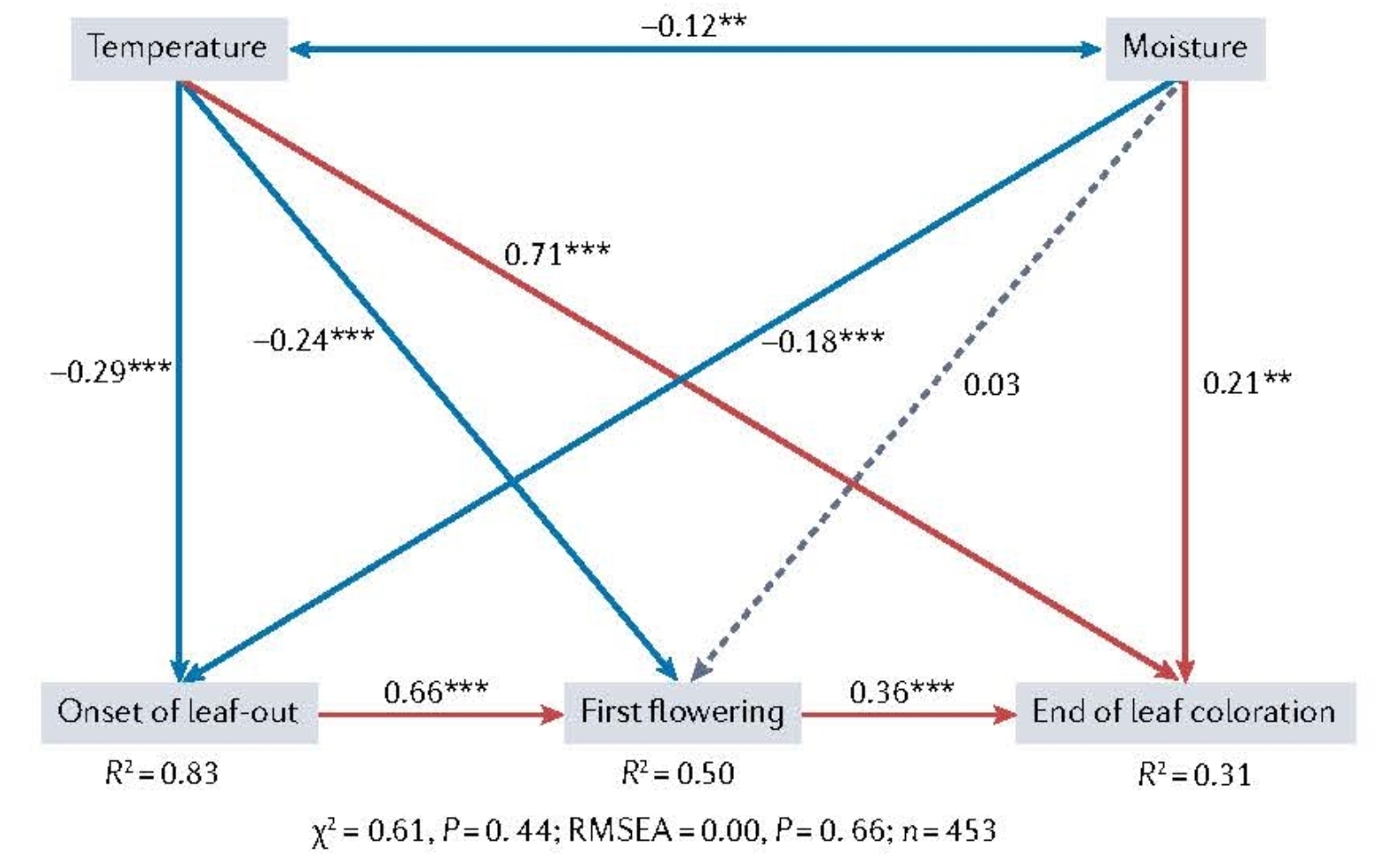 图4. 基于结构方程模型分析温度、土壤含水量和早期物候事件对物候的影响。红色箭头表示正效应,蓝色箭头表示负效应,灰色虚线箭头表示无显著效应。箭头上的数字是标准化路径系数,反映了变量影响的大小(*** P < 0.001,** P <0.01)。R2表示由温度、土壤含水量和/或早期物候事件解释的变异比例。构建模型使用的数据来源于青藏高原(主要在高山草甸上进行)的控制实验。