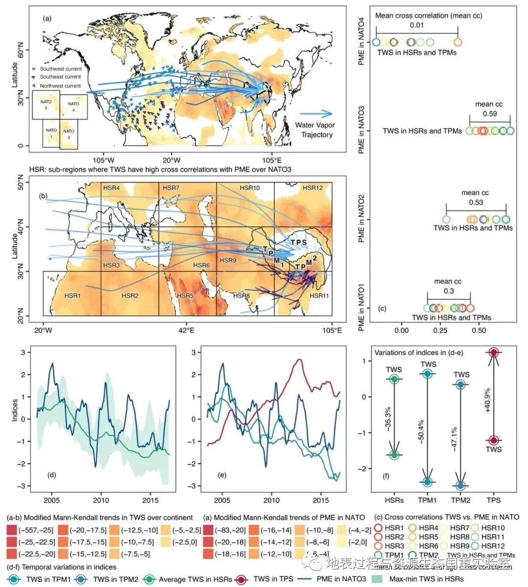 张强教授团队在深入剖析亚洲水塔水汽循环过程的基础上,全面量化了青藏高原的大气环流过程,系统解决了亚洲水塔研究中尚未解决的难点问题。研究团队全面论述并阐明了青藏高原陆地水储量演变的空间异质性及其背后的大气动力学机制(图1)。研究结果表明,青藏高原南部亚洲高山区的陆地水储量下降主要是受西风带传输的源自北大西洋东南部降水-蒸发(PME)亏缺的影响。此外,研究团队还通过动力学模拟证实了亚洲高山区阻止了PME亏缺进一步向青藏高原中部地区的传播,进而引发了青藏高原中部地区陆地水储量的增加。