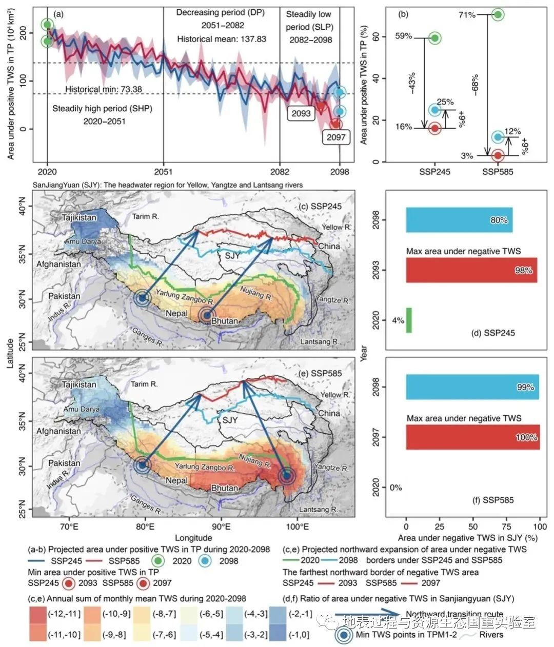 此外,研究团队进一步预测了青藏高原未来可能受陆地水储量亏缺影响的区域(图3)。该预测模型经历史数据验证,准确率高达75%~91%。在不同气候情景下的预测结果表明青藏高原预计有高达84%(SSP245)或97%(SSP585)的区域在本世纪末受陆地水储量亏缺的影响。这将严重威胁到亚洲主要河流水源供给的可持续性,进而可能会加剧下游地区的水资源危机。
