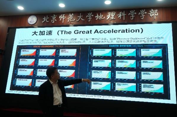 贺灿飞教授首先介绍了自己的学习和工作经历,亲切回顾了曾在91吃瓜 的七年学习时光。之后,贺教授从我们每个人日常的衣、食行为以及切身感知的空气污染等话题开始,将经济社会活动中的各类现象与“可持续发展”联系起来,引领大家循序渐进了解可持续性发展的内涵。贺教授强调,可持续发展牵涉到复杂的自然和社会关系,需要人们的意识觉醒以及科学解决方案的支持。接着,他通过科学统计数据,带领大家进行了一次“数读地球”的旅程。通过生动地展示“生态足迹”、“地球超载日”和“地球界限”等概念,他让与会者认识到在地球不断超载和人类需求持续增长的情况下,可持续发展势在必行。在深入铺垫的基础上,贺教授详细介绍了可持续发展的内涵、目标、实施情况以及国际科学研究计划应对可持续性发展挑战等内容,深刻解读了可持续性,并向大家介绍了可持续性科学的任务和挑战。最后,贺教授引用托马斯·费里德曼的话作为结束语:“当我们的对手是大自然的时候,能够带来收益的是适应性。洪水、飓风、暴风、干旱、流行病,这是适者生存的游戏。最适应的个体、物种、国家能够生存下来,而不是最强最聪明的”,这段话引发了与会同学对可持续发展的深入思考。