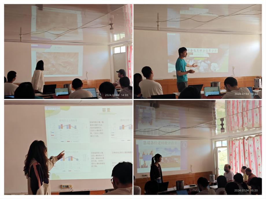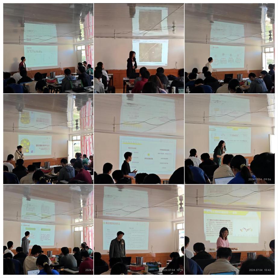 在7月4日的实习汇报中,上午各小组将自主实习的成果进行总结与汇报,每个小组的内容都十分丰富精彩。有的小组在助教的指导下探究当地优势种的分布特征;有的小组探究基地前人人可见却形成原因不明的鼓丘,期望给出合理的证据明确鼓丘类型;有的小组每人日均三万步,翻山越岭为了制作一张实习区的植被类型分布图......尽管本次自主实习的时间较短,但是同学们仍然取得了不错的成果,并在与老师和同学们的交流中有了新的认识,对于本组选题具有深入研究兴趣的同学也将部分样品带回学校准备进行更深入的实验与探索。在下午的汇报中,两个实习大组分别对植物、土壤实习所学知识与测量数据结合具体探究问题进行汇报。老师们对大家的实习成果进行点评并高度赞扬了大家数天来的付出,同学们也表示自己在本次实习中收获良多,学习兴趣盎然。