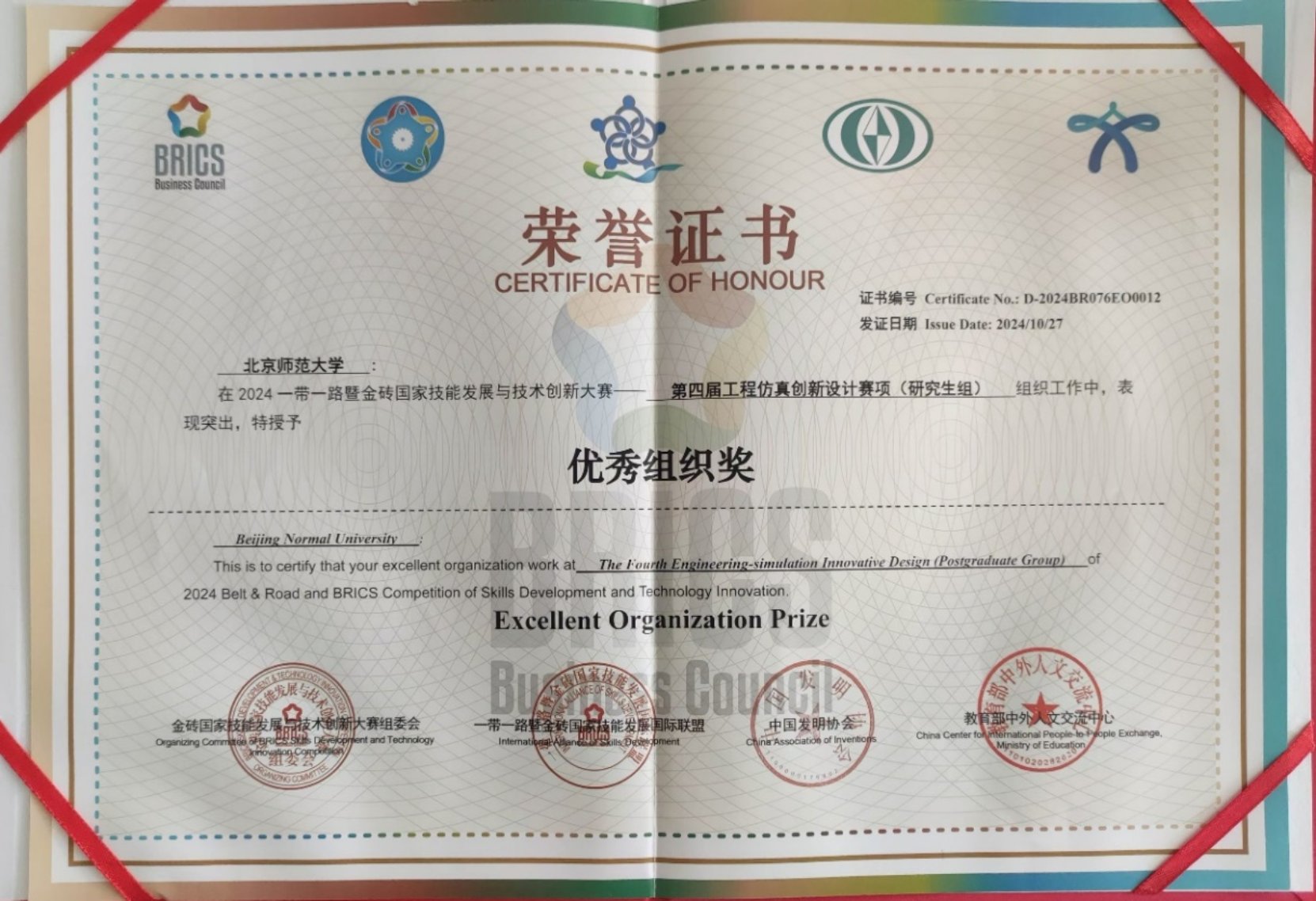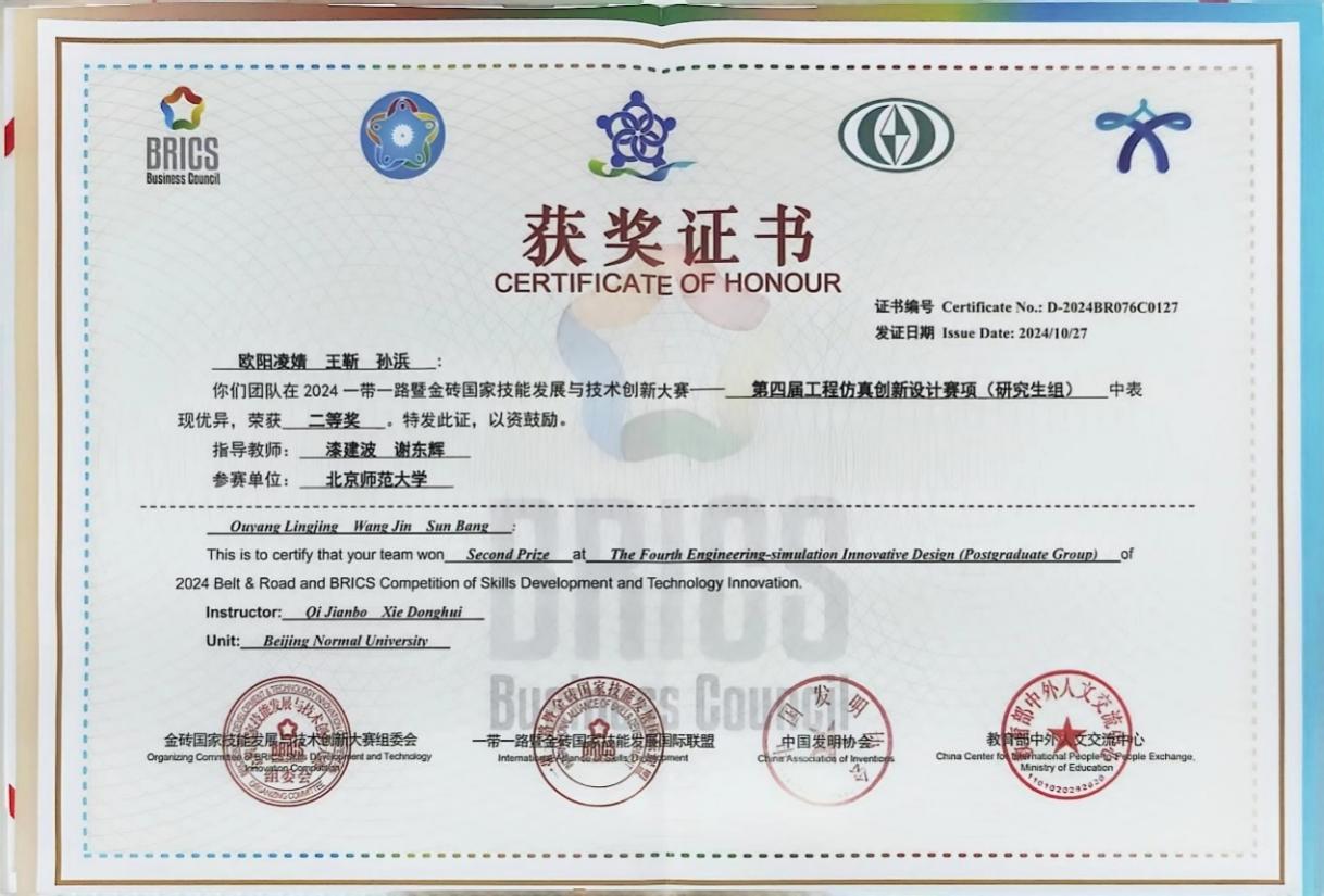 2024年10月25,由中国发明协会、金砖国家工商理事会中方理事会主办的2024“一带一路”暨金砖国家技能发展与技术创新大赛之第四届工程仿真创新设计赛项总决赛在宁夏大学举办。91吃瓜-吃瓜王-吃瓜网站 学生孙浜、欧阳凌婧、王靳组成的团队以“叶绿素荧光遥感传感器辐射信号仿真”为题荣获研究生组二等奖,学部谢东辉副教授和漆建波副教授荣获“优秀指导教师”称号,91吃瓜 荣获“优秀组织单位”称号。
