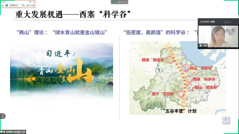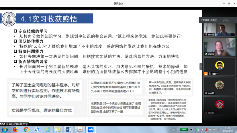 8月10,云实习正式开始。两个小组同学开始编制湖州市妙西镇总体规划纲要初步方案,地理科学学部和湖州市规划院的导师全程指导同学们的实习。同学们克服了不能去现场调研的困难,通过高效的分工协作,深入的讨论交流,经过10天紧张有序的工作,各自独立完成了妙西镇总体规划纲要成果。