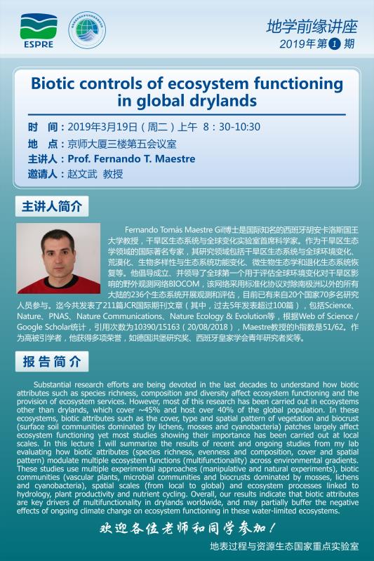 【3月19日讲座】Fernando T. Maestre-Biotic controls of ecosystem functioning in global drylands